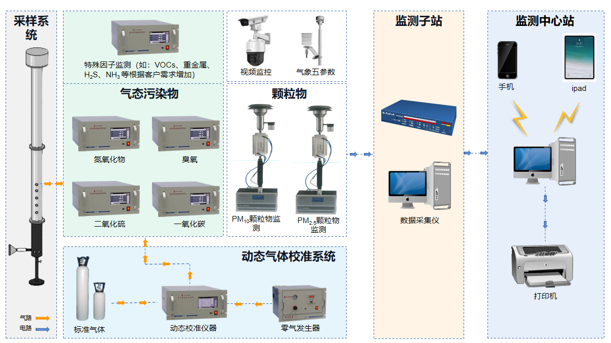 大氣質(zhì)量監(jiān)測解決方案根據(jù)國家標準要求,主要針對污染監(jiān)控點、空氣質(zhì)量評價、空氣質(zhì)量對照點和空氣質(zhì)量背景點的環(huán)境空氣進行監(jiān)測、實現(xiàn)大氣質(zhì)量監(jiān)測數(shù)據(jù)采集傳輸和分析評估。常規(guī)大氣質(zhì)量監(jiān)測參數(shù)主要包括SO2、NOx、O3、CO、PM10、PM2.5、氣象參數(shù)??梢愿鶕?jù)客戶的特殊需求,在常規(guī)監(jiān)測的基礎(chǔ)上增加特殊因子監(jiān)測模塊,如:VOCs、大氣重金屬、H2S、NH3等。